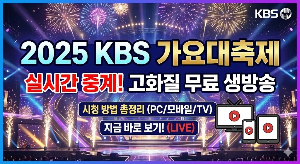 2025 KBS 가요대축제는 다양한 방법으로 실시간 시청이 가능합니다. TV가 없어도 PC, 스마트폰, 태블릿으로 언제 어디서나 고화질 생방송을 즐길 수 있습니다.